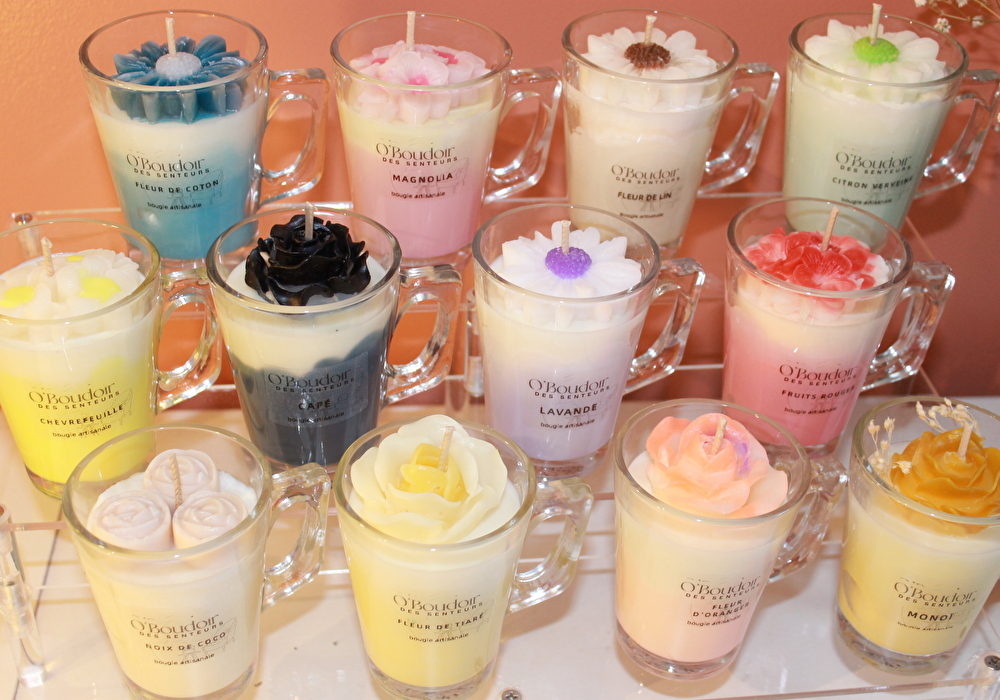 Les bougies sont confectionnées avec de la cire de soja ou de colza sans OGM, les mèches sont en coton, les parfums sont commandés à Grasse (06) , sans CMR (cancérogène, mutagène, reprotoxique), sans phtalates. Ingrédients 100 % naturel.