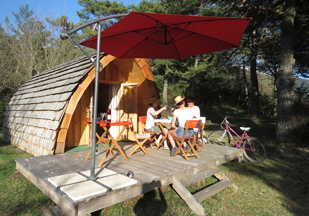 Deux habitats en bois isolés en forme d'ogive pour 2 et 3 personnes avec terrasse en sous bois.