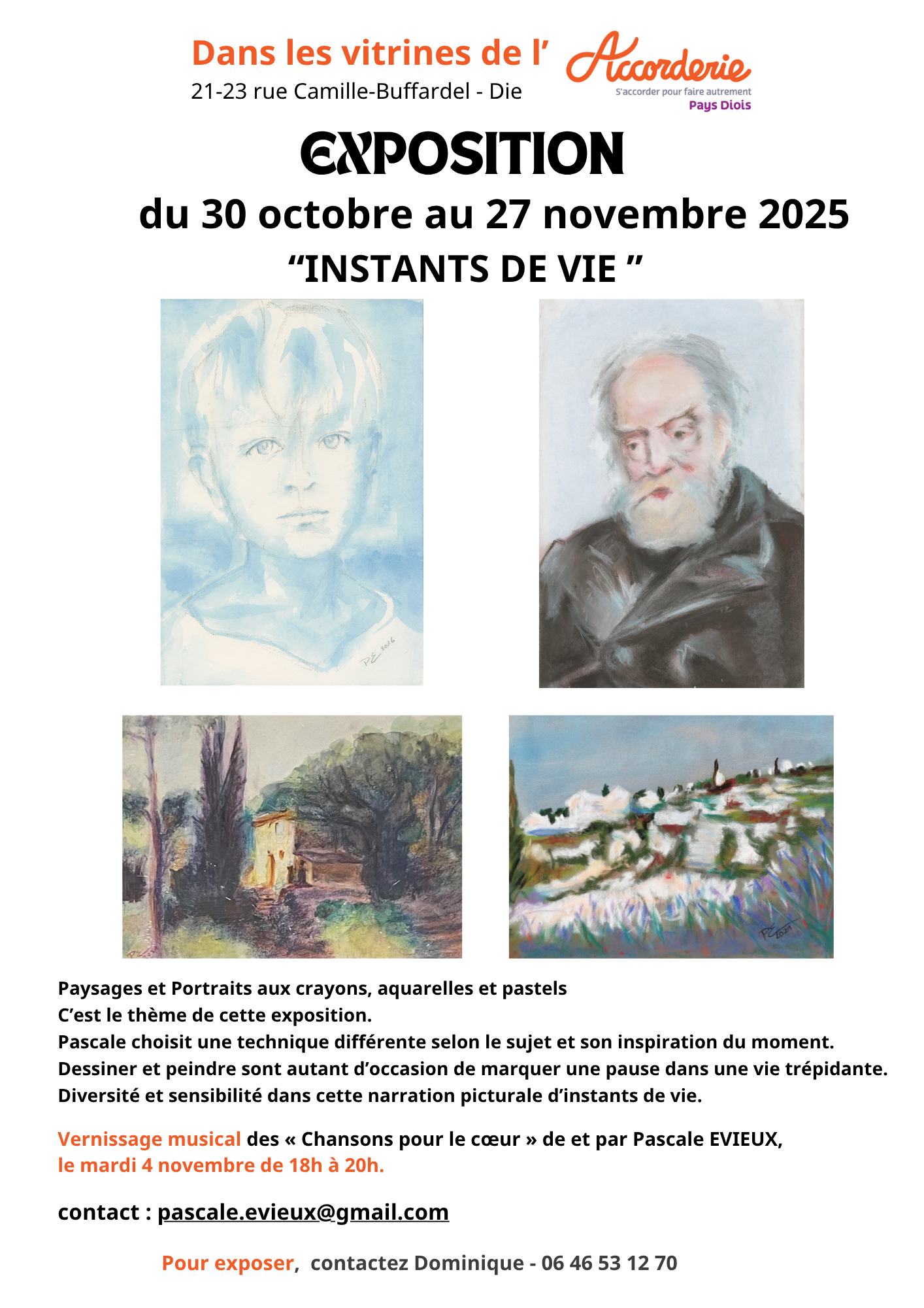 Vernissage musical des « Chansons pour le cœur » de et par Pascale EVIEUX, le mardi 4 novembre de 18h à 20h.Paysages et Portraits aux crayons, aquarelles et pastels