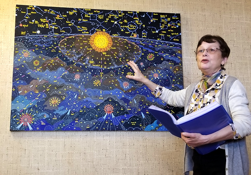 Marie-Jo leidt u rond door haar schildersatelier. Ze exposeert er recente werken van groot formaat rondom het thema astronomie, natuur- en scheikunde, en oudere werken geïnspireerd op de landschappen in de Vallon de la Jarjatte.