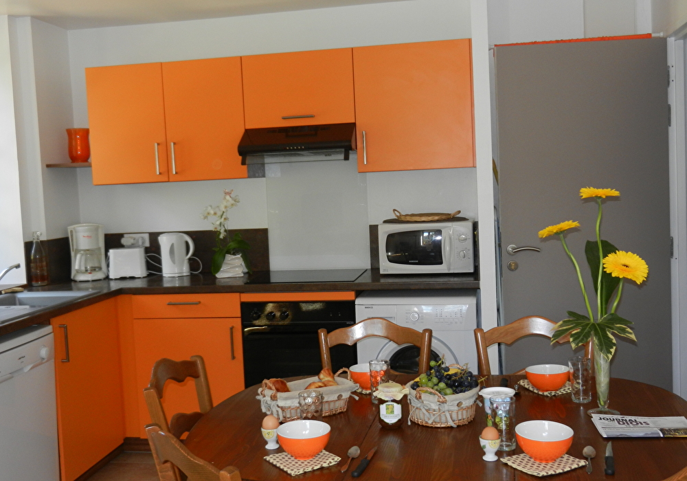 Vakantiewoning van 52 m², totaal comfort op de 1e verdieping in het grote pand van de eigenaar. Omheinde tuin. Eigen terras met zitje onder een grote lindeboom. Barbecue en ligstoelen ter beschikking. Fietsers en motorrijders van harte welkom. Babyspullen.