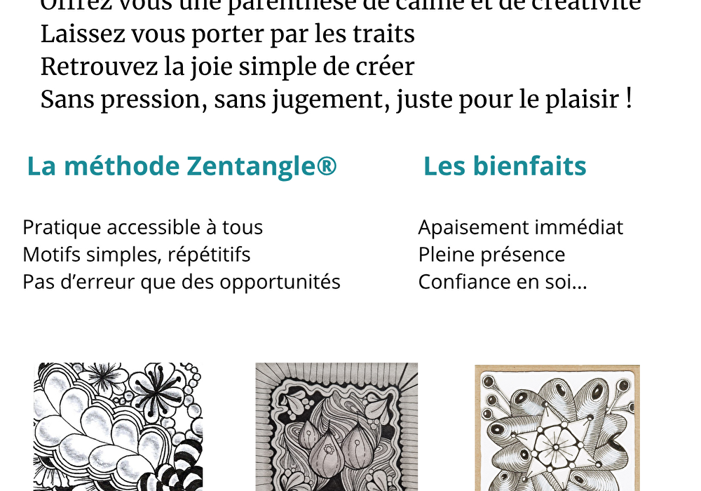 Basée sur des motifs simples et intuitifs, la méthode Zentangle favorise détente, concentration et lâcher-prise. Accessible à tous, elle s’adapte aussi au milieu professionnel pour stimuler la créativité et réduire le stress.