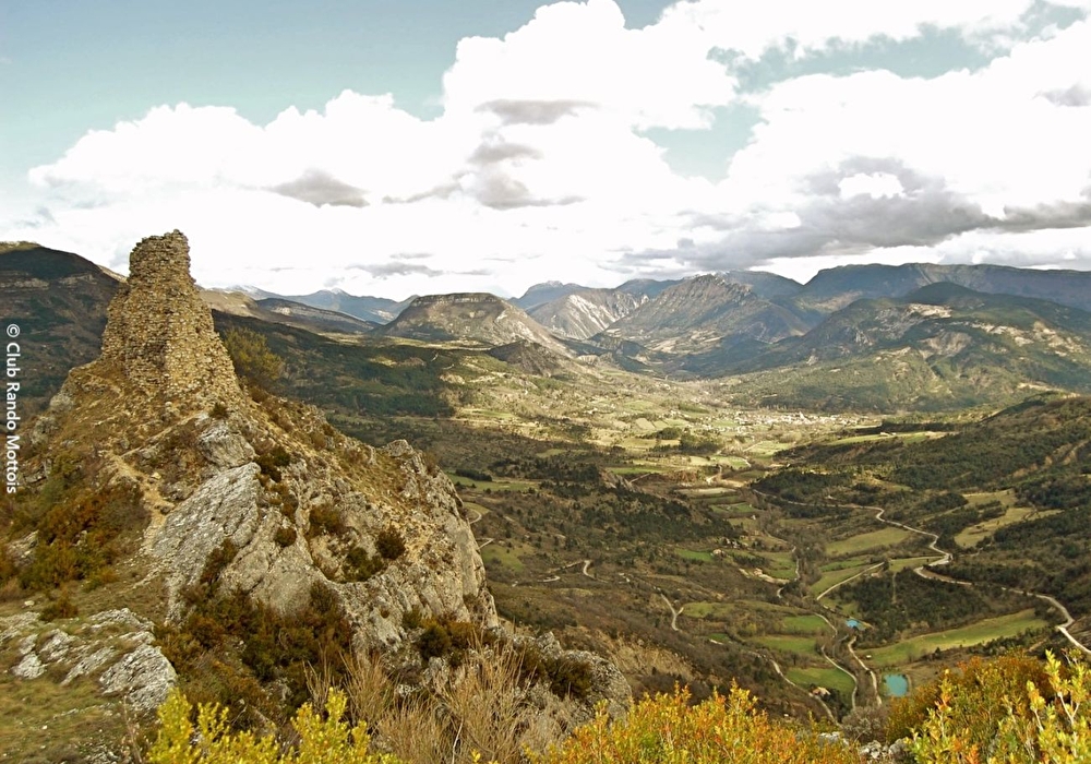 2/ Gravir le sentier à gauche. Il mène aux ruines du château bâti sur sa vire. Poursuivre par le sentier qui bascule derrière la falaise, plein nord, et qui ne tarde pas à grimper en lacets (prudence aux chutes de pierres aux abords des ruines). Le panorama s’ouvre sur la combe de Chalancon au nord et la cuvette de la Motte au sud. Atteindre le croisement du Rocher de Chalancon (alt. 1025m).