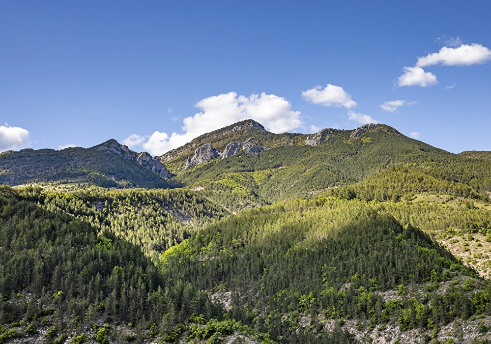 Au-dessus des gorges de l'Escaris, les lames de rochers viennent égayer la frondaison. Chaque ouverture de la chênaie laisse apparaître village champêtre ou vallée sauvage profondément entaillée par les rivières avec en fond la montagne de la Servelle.